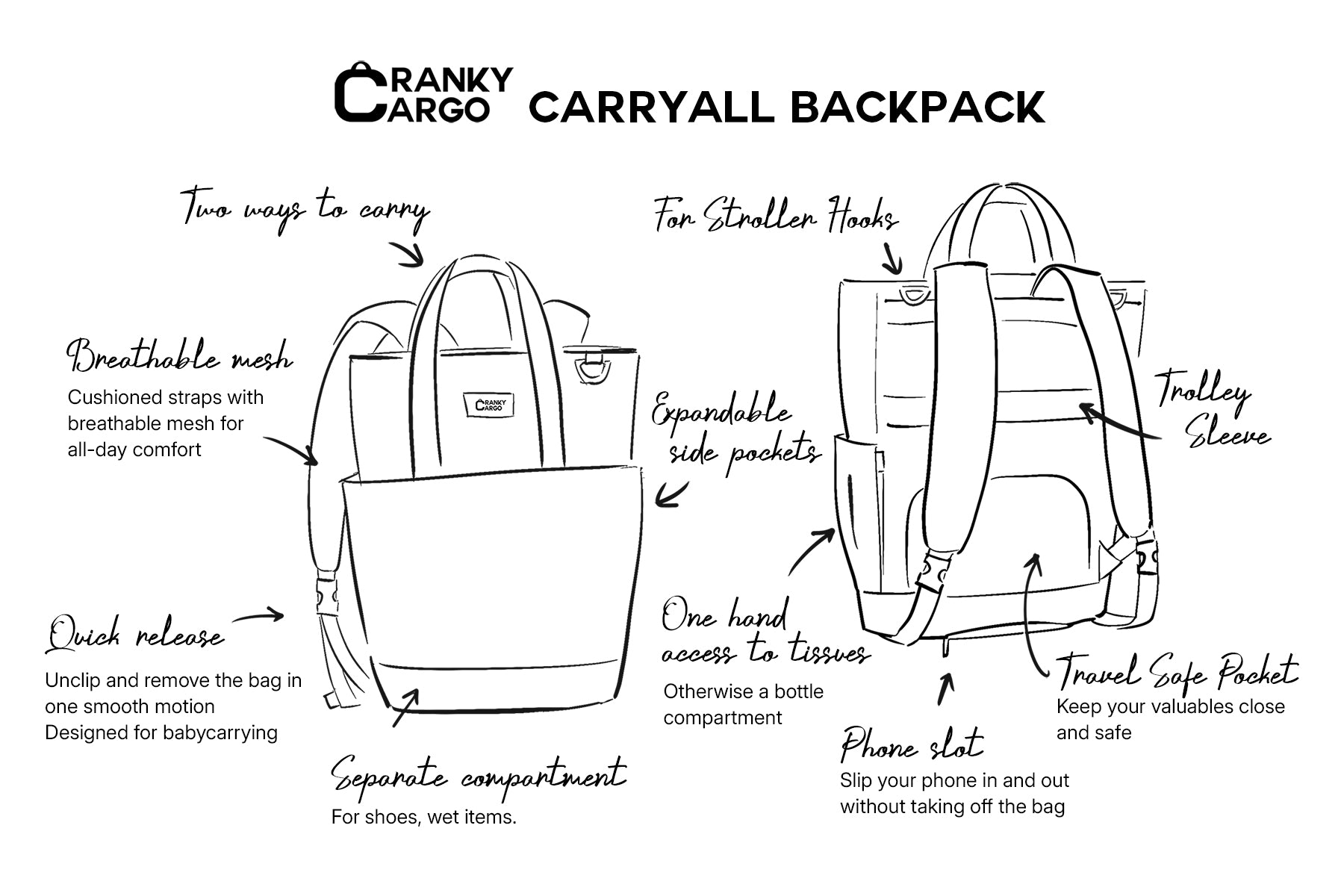 Designed by a mom and dad who needed a bag as reliable as it is stylish. Whether you’re traveling, hitting the gym, or having a day out with your kids (cranky moments included!), the Carryall Backpack is designed to keep up with you.
